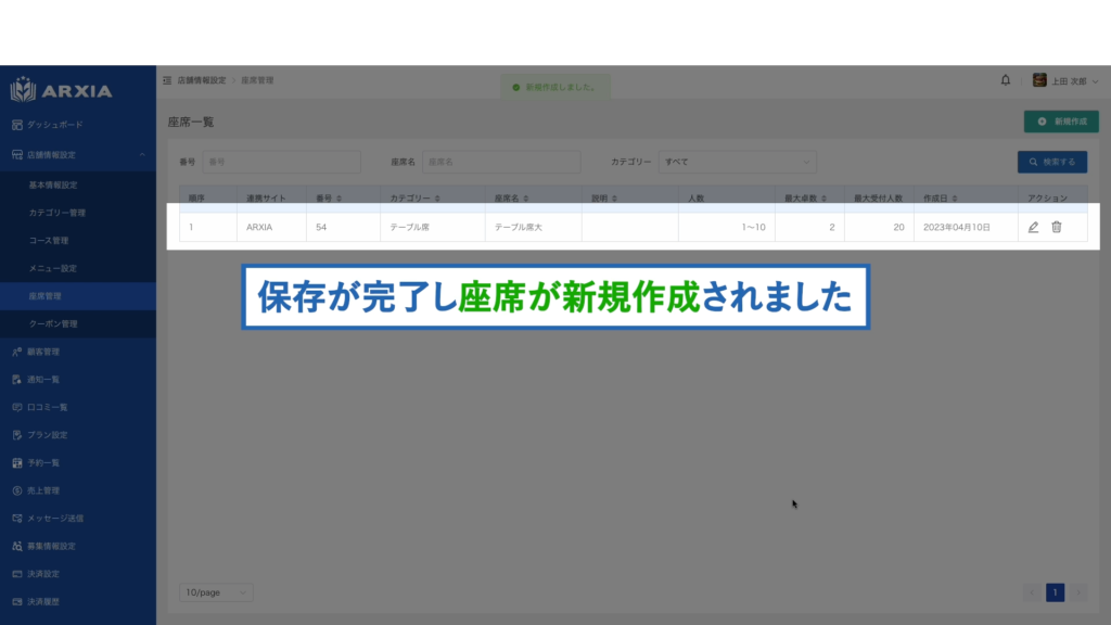 飲食座席設定(飲食)1.店舗管理画面へログインします2.店舗情報設定の「座席管理」をクリックします3.「新規作成」をクリックします4.各種情報を入力していきます5.設定が完了したら「保存」をクリックします6.保存が完了し座席が新規作成されます